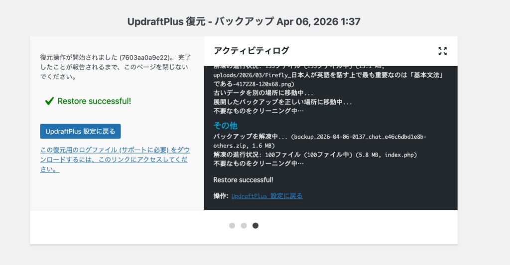 UpdraftPlus Backupは大容量の移行でも無料で使える、今のところ大きなミスがないプラグインです。他のプラグインは、そもそも容量制限があったり、移行後にメディアファイルが使えなかったりとトラブルがあるのでUpdraftPlus Backupはおすすめです